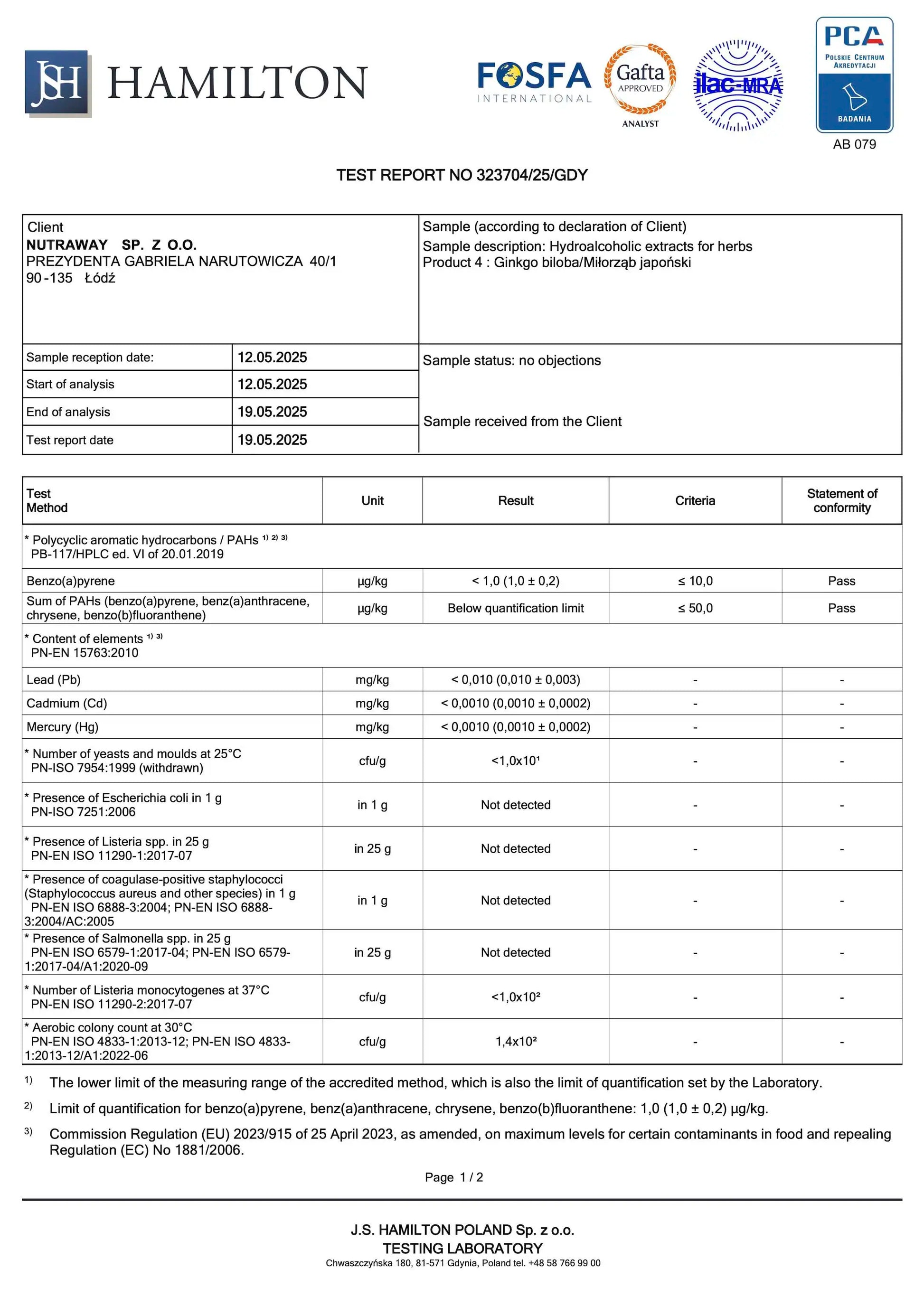Výzkum provedený společností J.S. Hamilton Poland Sp. z o.o. jménem Nutraway Sp. z o.o., vlastníka soukromé značky Ollywell. Byly testovány vzorky tekutého extraktu Ashwagandha. Studie byla provedena podle akreditované metody a výsledky platí pouze pro obdržené vzorky. Všechny výsledky uvedené ve zprávě jsou pod nejvyššími přípustnými úrovněmi kontaminantů stanovenými nařízením Komise (ES) č. 1881/2006 ze dne 19. prosince 2006. To znamená, že tekutý extrakt Withania somnifera je bezpečný pro konzumaci.