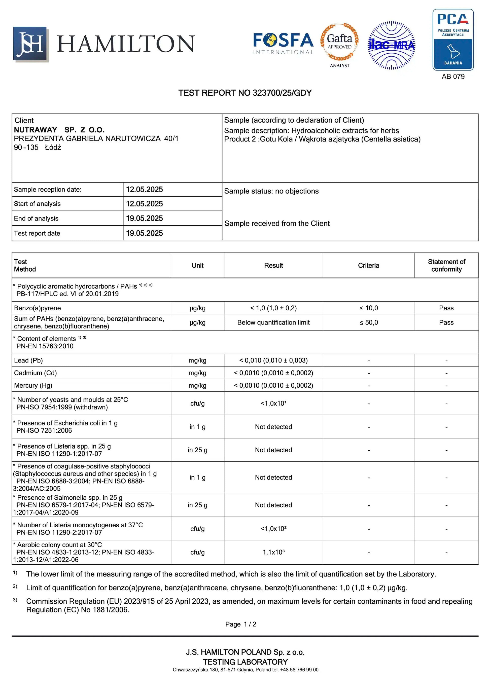Výzkum provedený společností J.S. Hamilton Poland Sp. z o.o. jménem Nutraway Sp. z o.o., vlastníka soukromé značky Ollywell. Byly testovány vzorky tekutého extraktu Gotu Kola. Studie byla provedena podle akreditované metody a výsledky platí pouze pro obdržené vzorky. Všechny výsledky uvedené ve zprávě jsou pod nejvyššími přípustnými úrovněmi kontaminantů stanovenými nařízením Komise (ES) č. 1881/2006 ze dne 19. prosince 2006. To znamená, že tekutý extrakt Centella asiatica je bezpečný pro konzumaci.